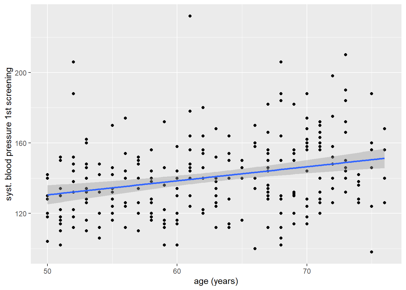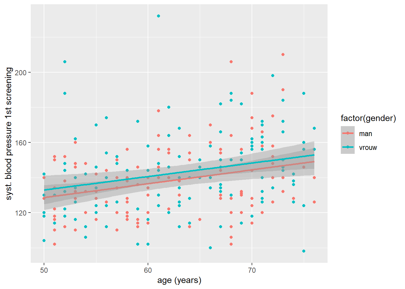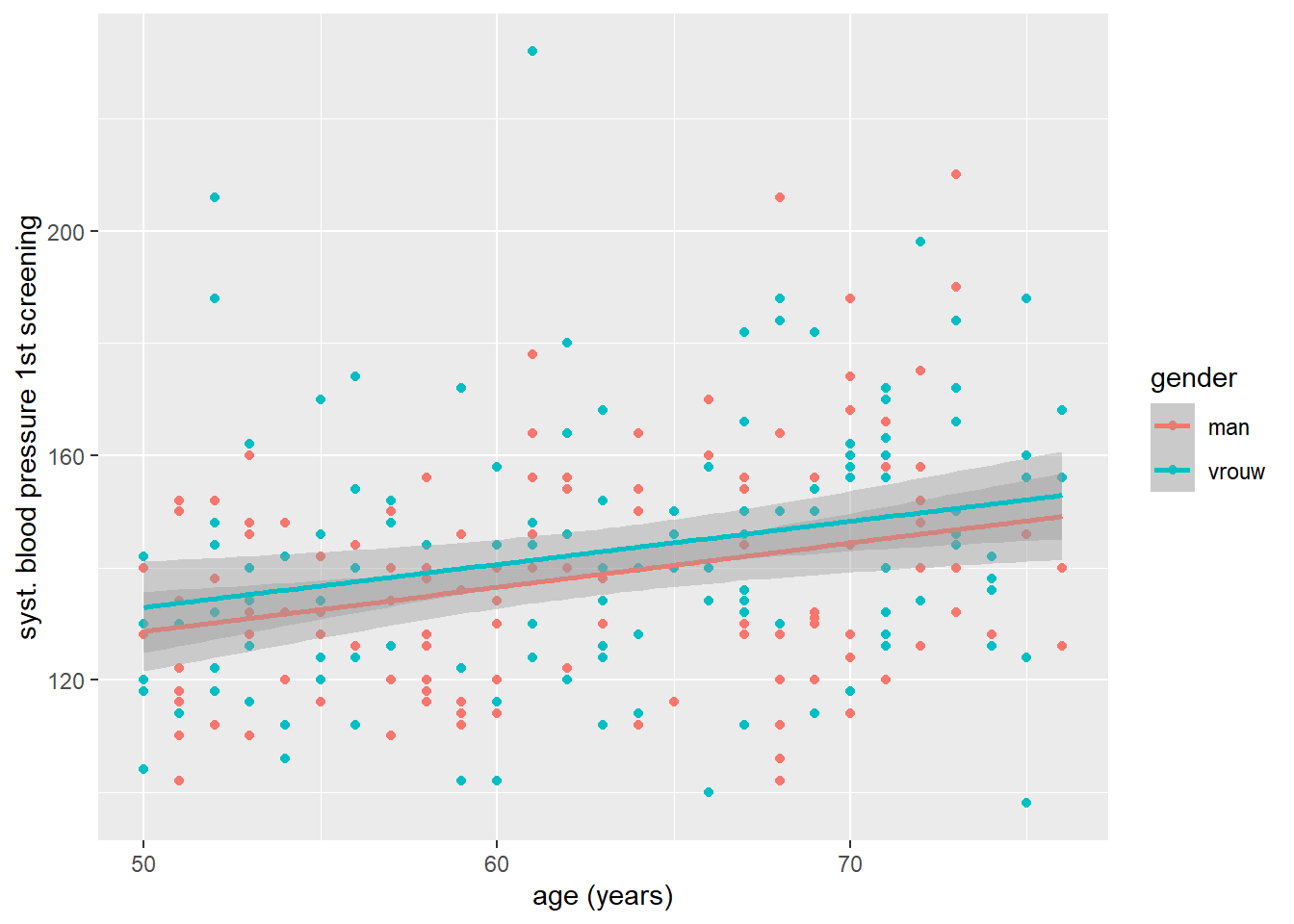Met de resulterende scatterplot kunnen we al enigszins een positieve relatie tussen leeftijd en bloeddruk zien, maar om dat iets duidelijker te maken kunnen we nog een regressielijn laten in tekenen. Dit kunnen we doen door een extra geom() over onze bestaande plot heen te leggen: in dit geval geom_smooth(). Met deze geom kunnen we de samenhang tussen twee variabelen samenvatten met behulp van een schattingsmethode die we met het argument method = kunnen aangeven. In ons geval gaan we method = "lm" gebruiken, wat voor ‘linear model’ staat.