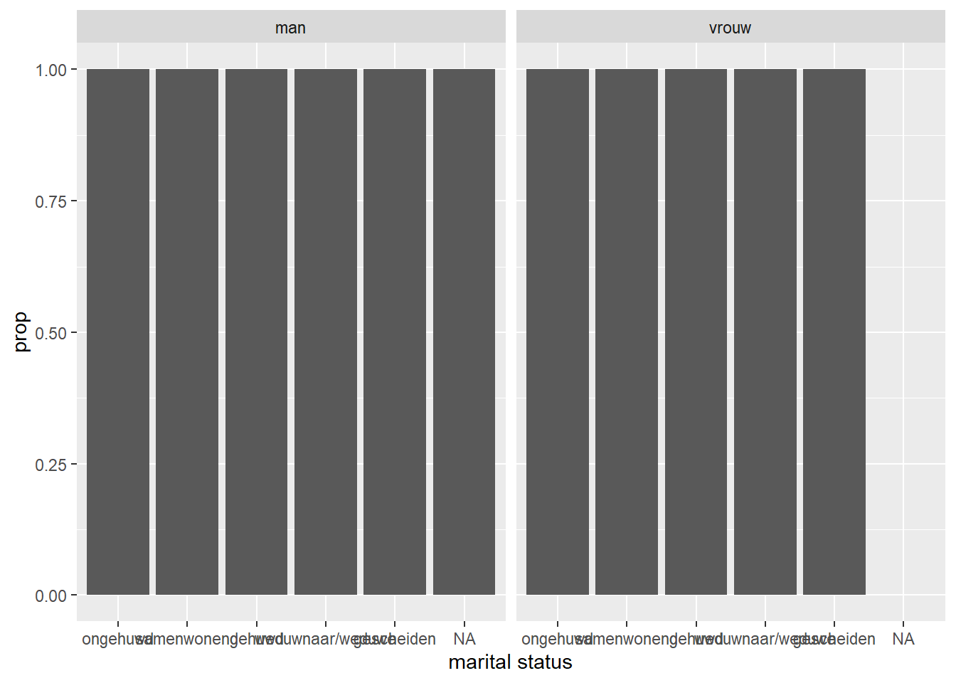 Een andere manier waarop we kunnen stratificeren is het maken van zogeheten facetten met de functies facet_wrap() en facet_grid(). Hiermee kun je losse paneeltjes maken voor verschillende categorieën van een derde variabele. Laten we het eens proberen voor de staafdiagram van huwelijksstaat. We maken gebruik van facet_wrap, de meest eenvoudige van de twee. Dit is geen geom, maar wel een aparte functie die weer ‘op kunnen tellen’ bij de rest van onze ggplot(). Binnen facet wrap moeten we met een tilde ~ aangeven welke variabele voor de facetten willen gebruiken. Het omzetten van de factor is hier niet strikt noodzakelijk. Zonder in al te veel detail te treden is facet_wrap() vaak het meest geschikt voor één variabele of twee variabelen met een verschillend aantal categorieën.