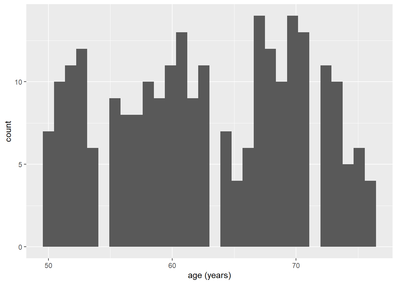 Als we nu de code draaien zien we dat we nu een x-as hebben gekregen met leeftijd in jaren, maar verder nog helemaal niks. Het laatst wat we nu moeten doen om een plaatje te krijgen, is het oproepen van een zogeheten geom() wat afgekort ‘geometric’ object betekent. Er bestaan een heleboel geoms, waarvan wij nu met geom_histogram() gaan werken. We kunnen de geom() toevoegen aan de ggplot(), door deze er bij ‘op te tellen’, als een soort nieuwe laag die we over het grijze canvas heen plakken: