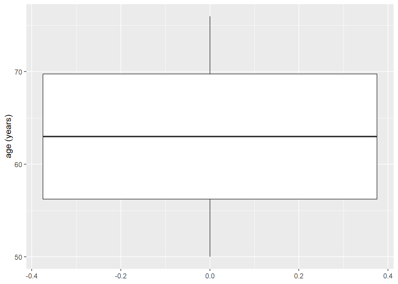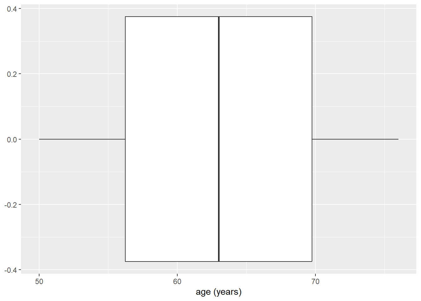 Een andere manier om continue gegevens, zoals leeftijd, te visualiseren is met behulp van een ‘boxplot’. Ook voor dit type visualisatie heeft ggplot() een aparte geom: geom_boxplot(). We kunnen de geom_histogram() eenvoudig omwisselen voor de geom van de boxplot: