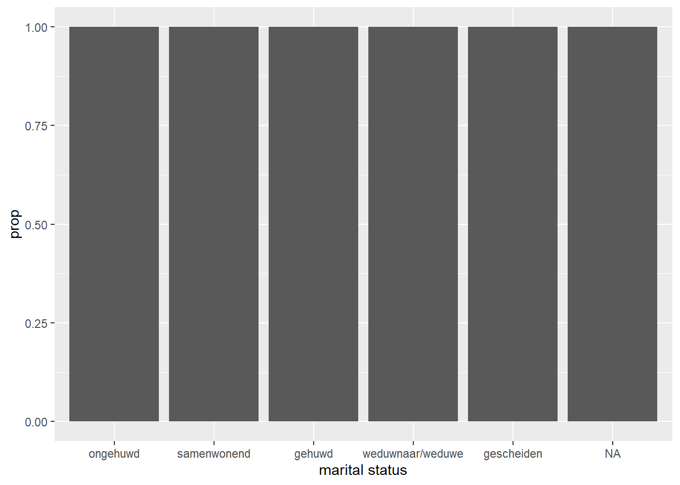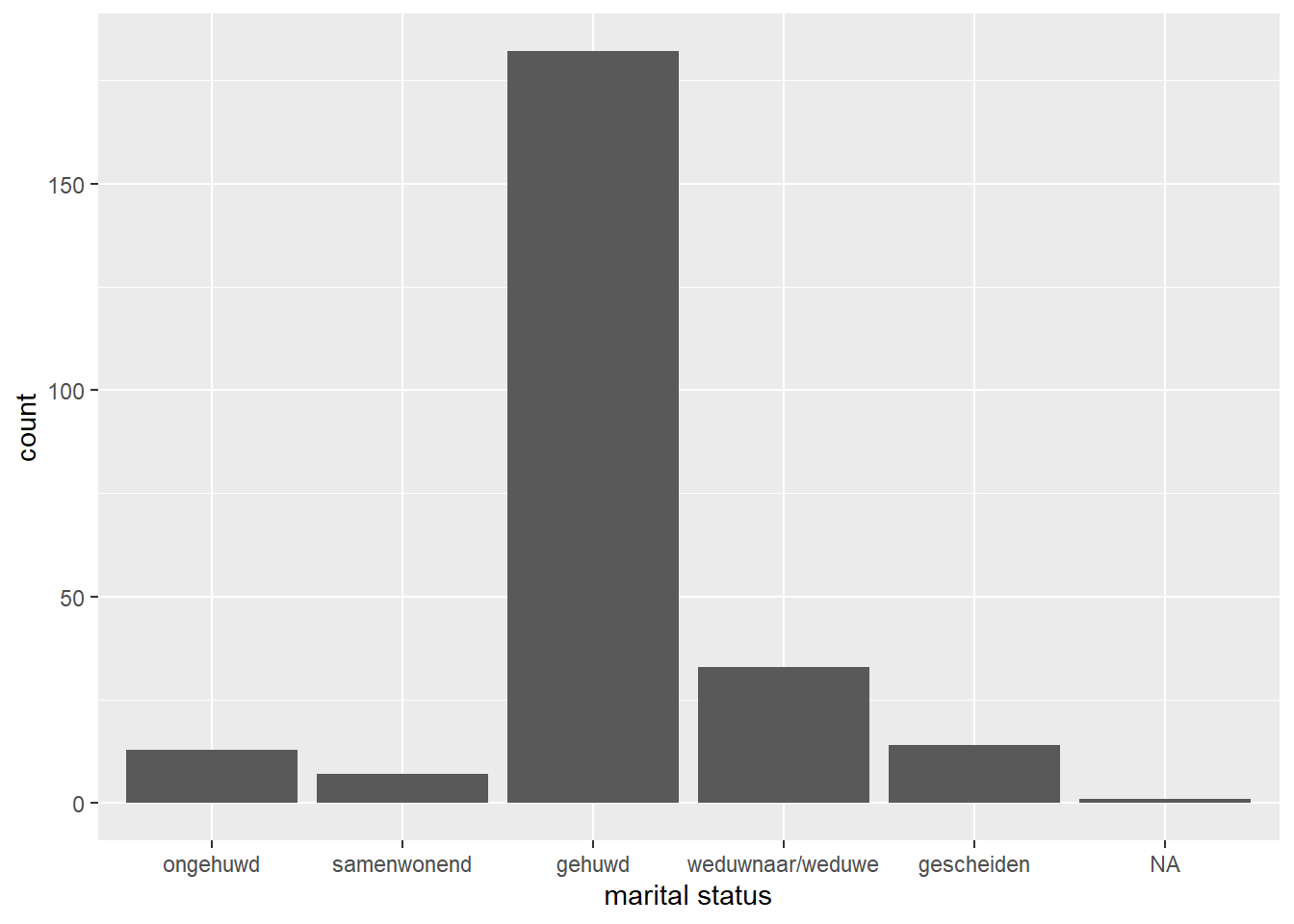 We zien een aantal zaken: als eerste hebben we een ‘warning’ gekregen die luidt: ‘Removed one row containing non-finite outside the scale range (stat_count()). Dit houdt in dat geom_bar() een niet-eindige waarde heeft verwijderd die niet op de schaal voorkomt. In vrijwel alle gevallen gaat het dan vaak om een’NA’ waarde, NA staat voor not available en is een missende waarneming waar R niet mee kan rekenen. Het tweede wat we zien is dat de categorieën geen naam hebben, maar getallen… dat is natuurlijk een beetje onhandig, want wat betekent huwelijksstaat ‘3’? Daar zullen we later op terug komen bij ‘plotjes vormgeven’.