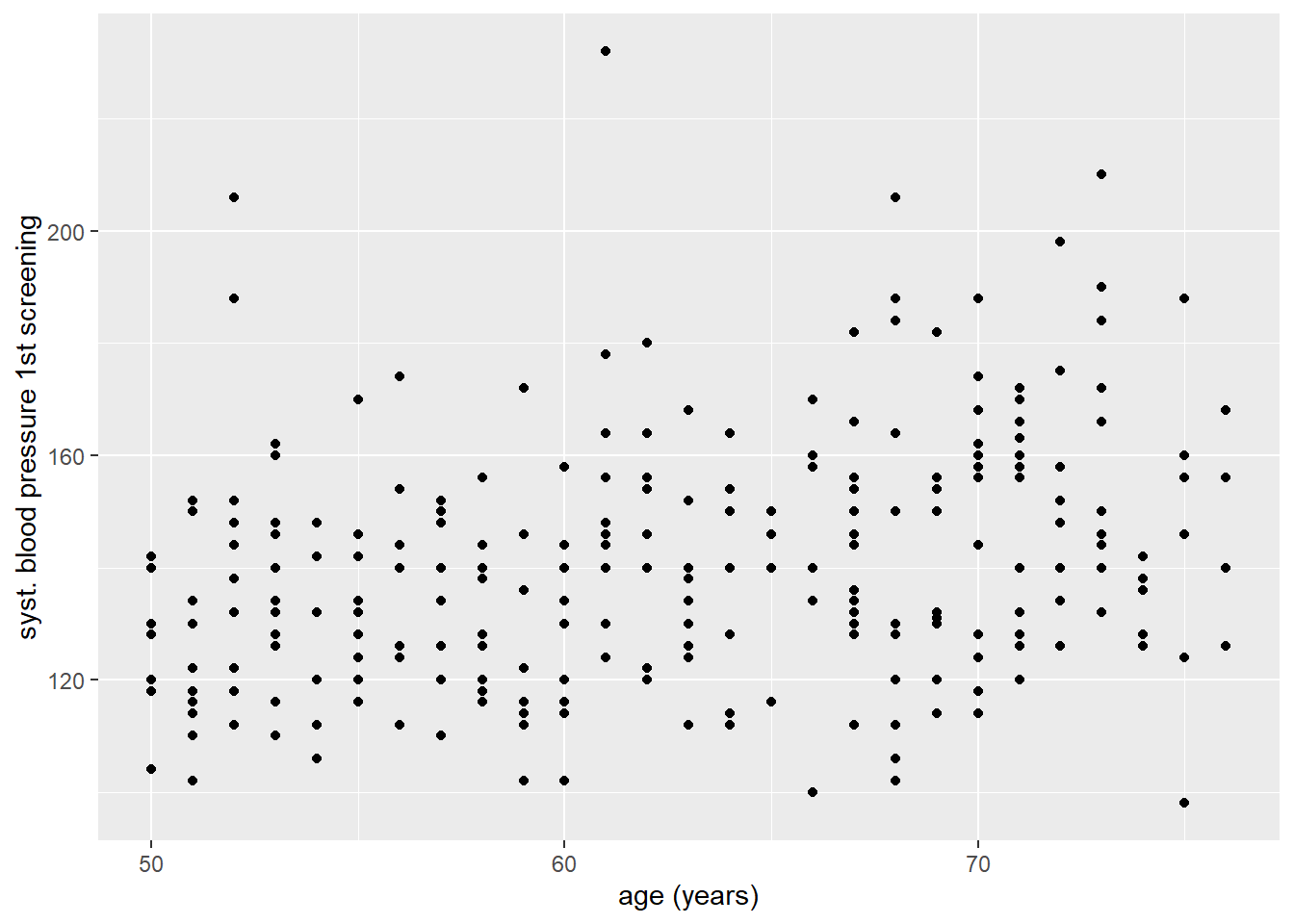 Tot dusver hebben we visualizaties gemaakt van enkele variabelen. Maar wat als we twee variabelen aan elkaar willen relateren? Daar zijn veel verschillende opties voor, maar een van meest voorkomende is de scatterplot, geom_point(). Laten we gaan kijken naar de samenhang tussen twee continue gegevens: leeftijd (op de x-as) en systolische bloeddruk (op de y-as). Naast dat we x = age specificeren binnen aes(), specificeren we nu ook y = sbp1s.